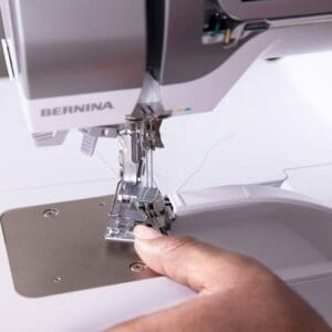 Plašs funkciju klāsts sniedz nepārspējamas šūšanas ērtības: Pēdiņa paceļas/nolaižas pusdūrienā, kas padara to vienkāršāku lietošanā. Pateicoties BERNINA Brīvroku sistēmai (FHS), pēdiņu var pacelt/nolaist ar ceļa sviru, lai Jūsu rokas vienmēr būtu brīvas un uz izstrādājuma. Pēdiņa viegli nolocās uz sānu, lai atvieglotu piekļuvi adatām, atpakaļ pēdiņa novietojas ar automātisko novietošanās funkciju.